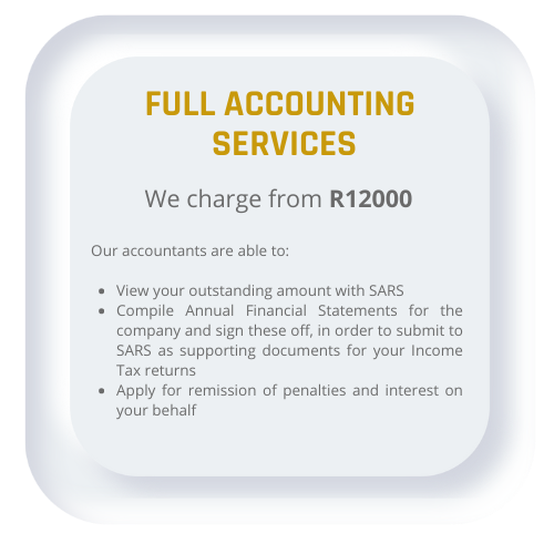 We often get enquiries from SME’s who have not correctly submitted company tax returns with SARS or have omitted such returns completely. These returns include tax returns not submitted or paid. In most cases, large penalties and interest has been levied against them by SARS.